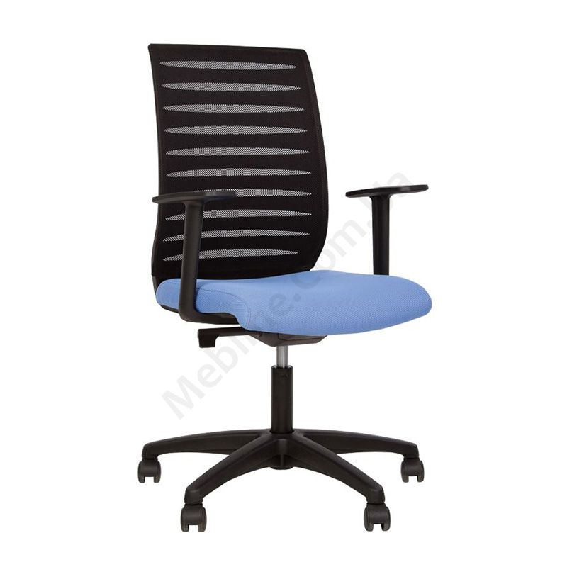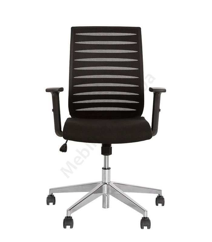 Стильне операторське крісло з дихаючою спинкою, нерегульованими пластиковими підлокітниками, фіксацією у вертикальному положенні, на алюмінієвій основі.