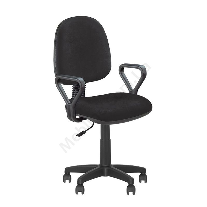 Бюджетне операторське крісло з підлокітниками, сидінням та спинкою покращеної ергономіки, на пластиковій основі.