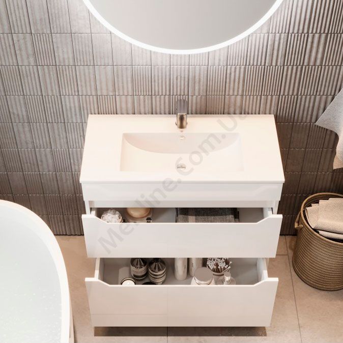 Тумба для ванної на ніжках з умивальником та висувними шухлядами.