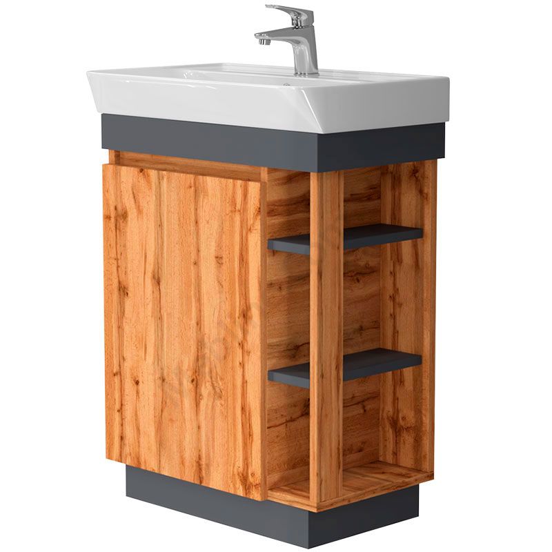 Тумба для ванної з умивальником, дверцятами та відкритими полицями.