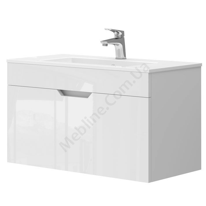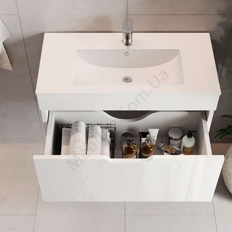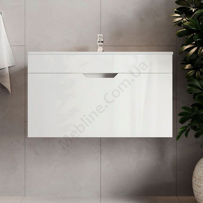 Навісна тумба для ванної з умивальником та висувною шухлядою.