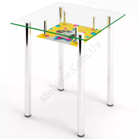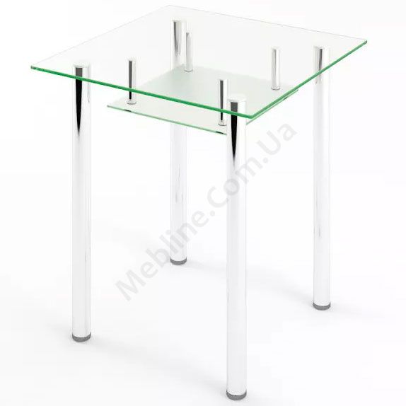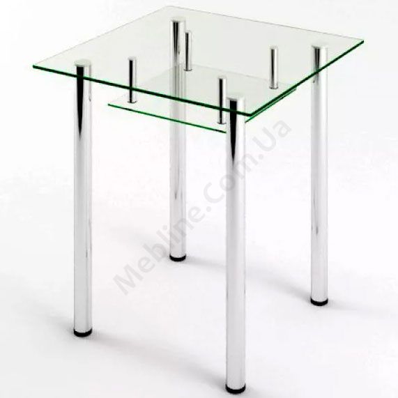 Квадратний скляний обідній стіл на металевих ніжках з поличкою.