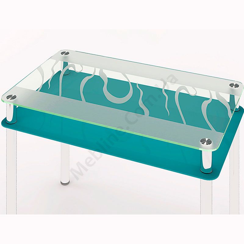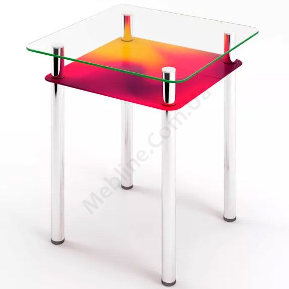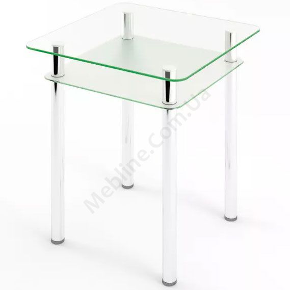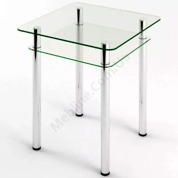 Квадратний скляний обідній стіл на металевих ніжках з поличкою.