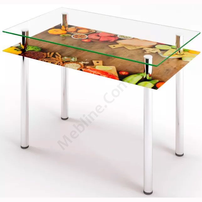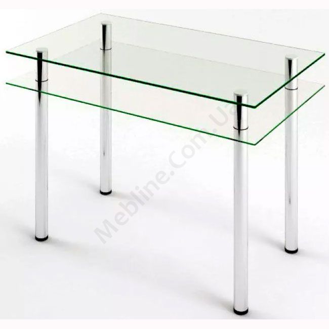 Прямокутний скляний обідній стіл на металевих ніжках з поличкою.