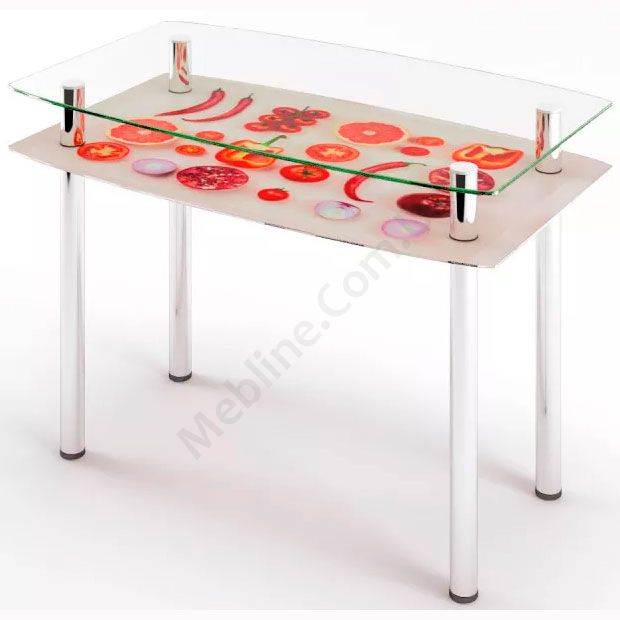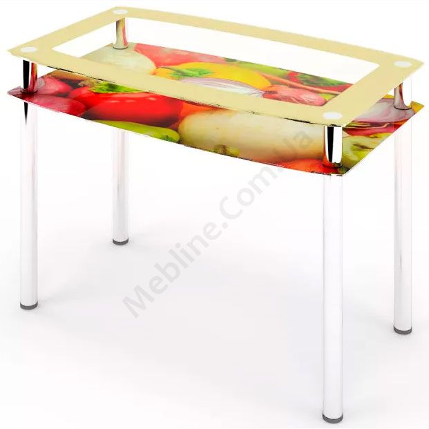 Прямокутний скляний обідній стіл на металевих ніжках з поличкою.