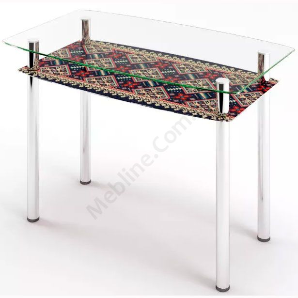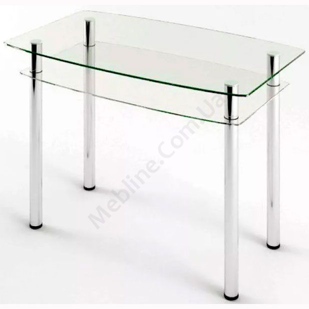 Прямокутний скляний обідній стіл на металевих ніжках з поличкою.