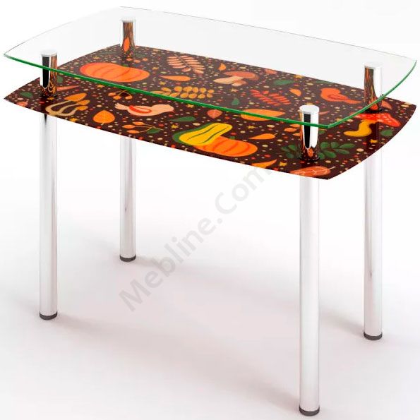 Прямокутний скляний обідній стіл на металевих ніжках з поличкою.