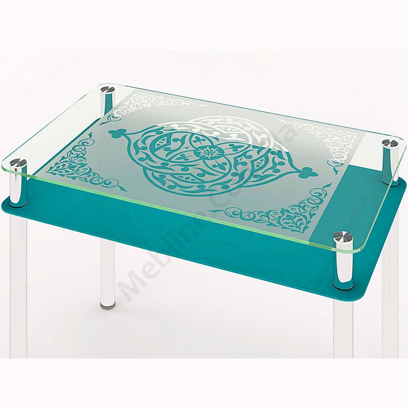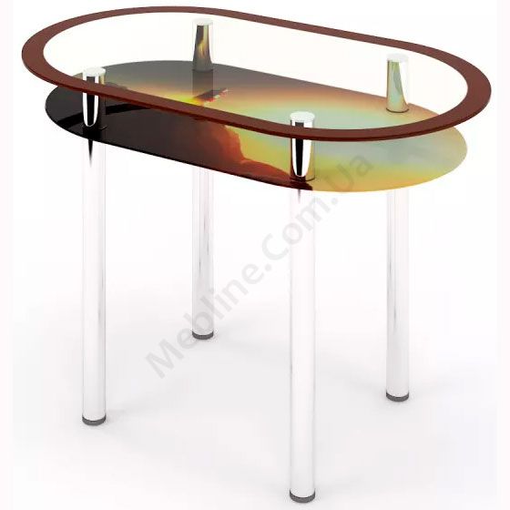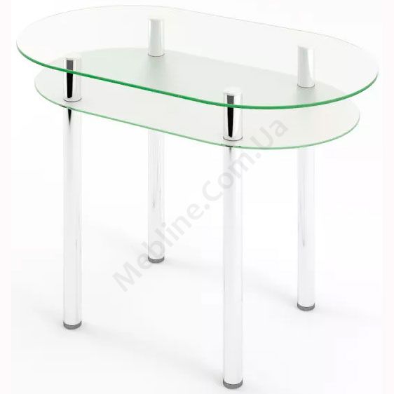 Овальний скляний обідній стіл на металевих ніжках з поличкою.