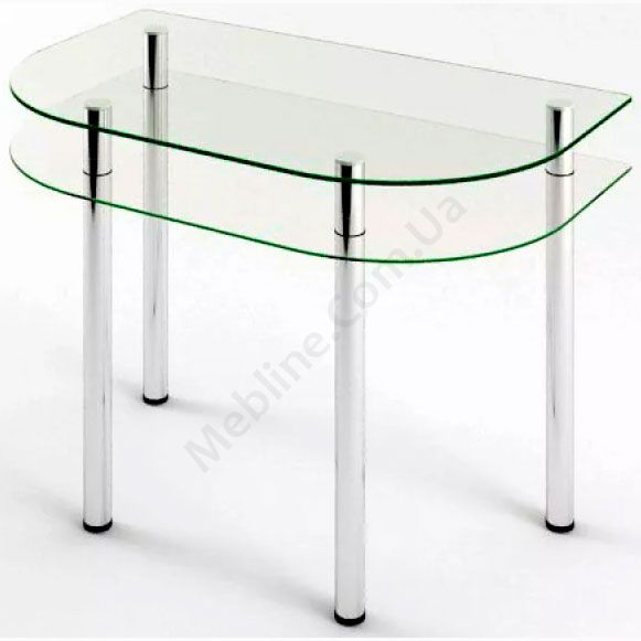 Фігурний скляний обідній стіл на металевих ніжках з поличкою.