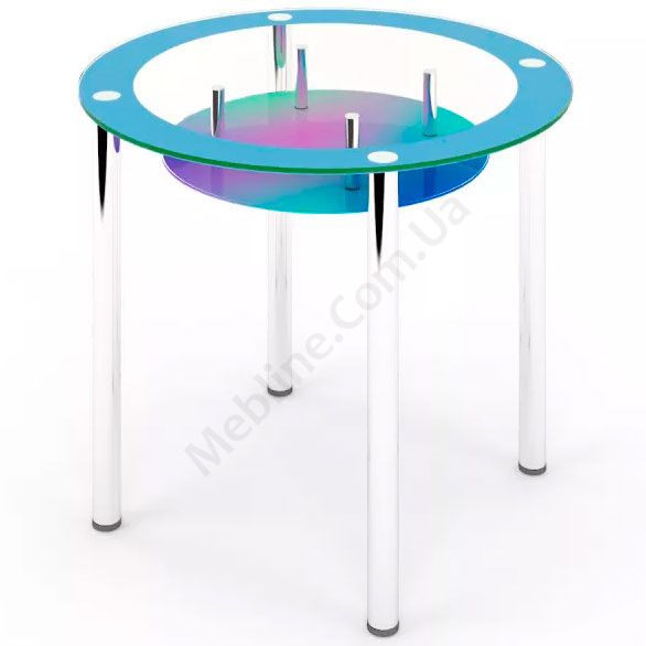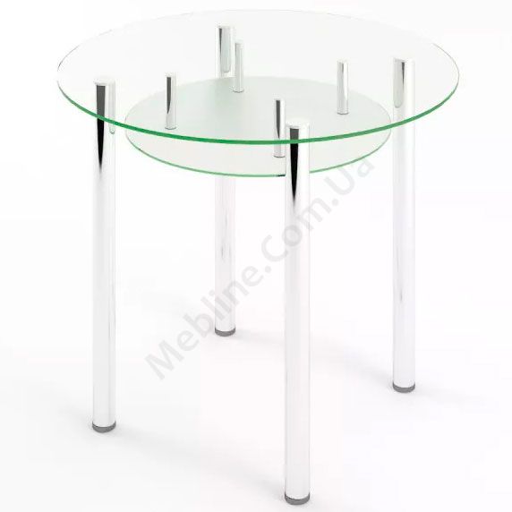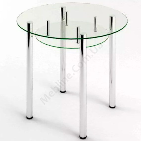 Круглий скляний обідній стіл на металевих ніжках з поличкою.