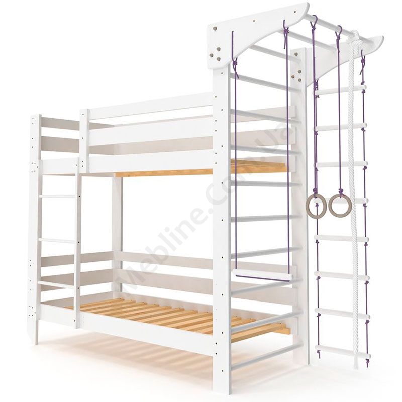 Дерев’яне двох’ярусне ліжко на ніжках зі спортивним куточком.