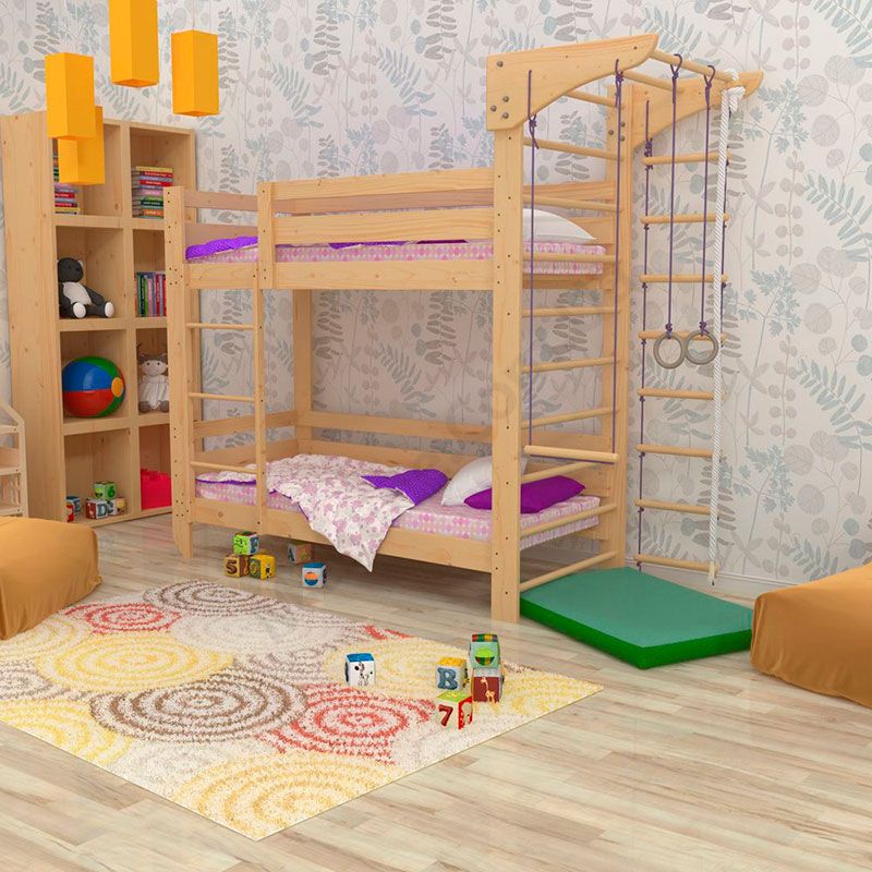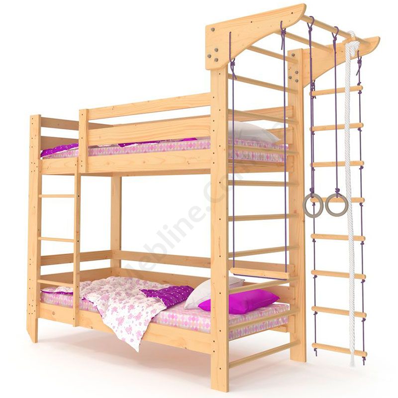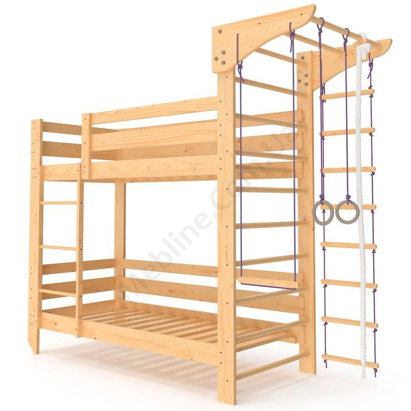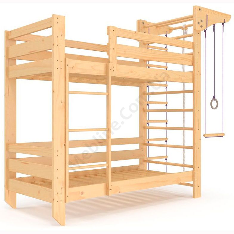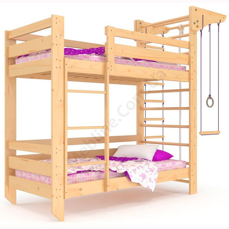 Дерев’яне двох’ярусне ліжко на ніжках зі спортивним куточком.
