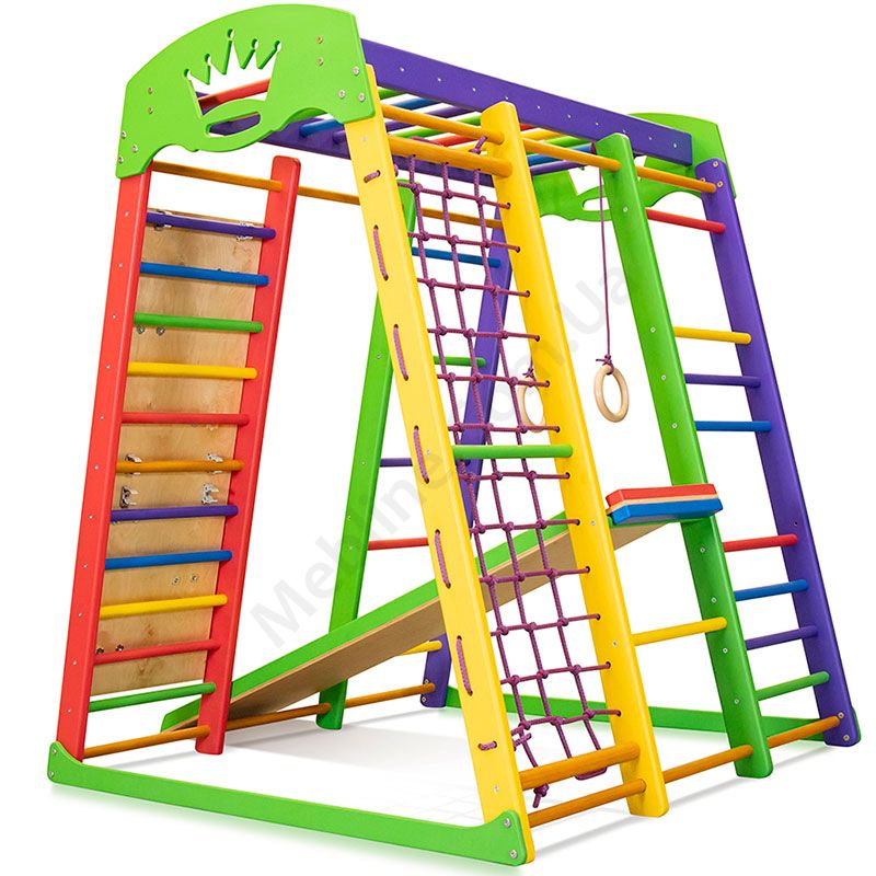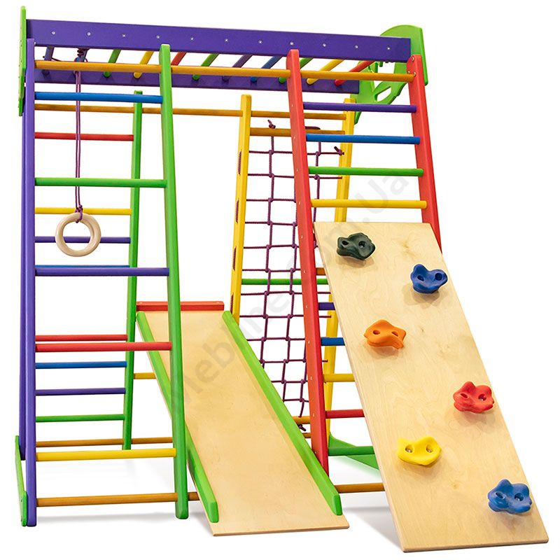 Дитячий спортивний комплекс для дому з гіркою, шведською стінкою, скалелазкою та сіткою.