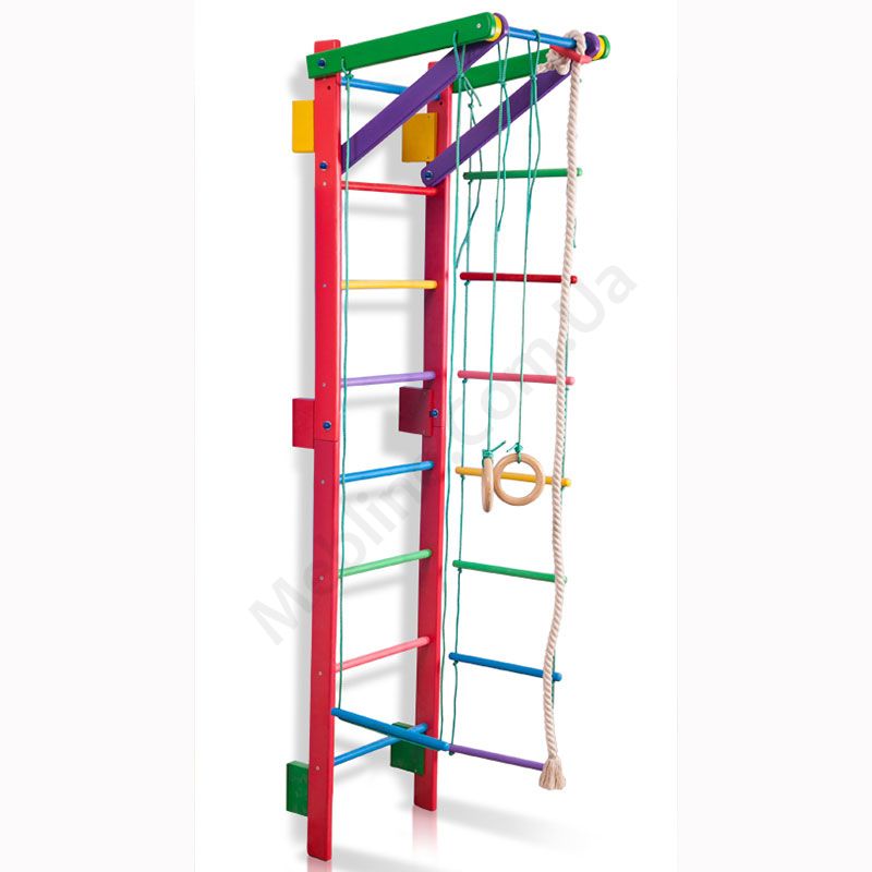 Шведська стінка з турніком, канатом, кільцями, трапецією та мотузковими сходами.