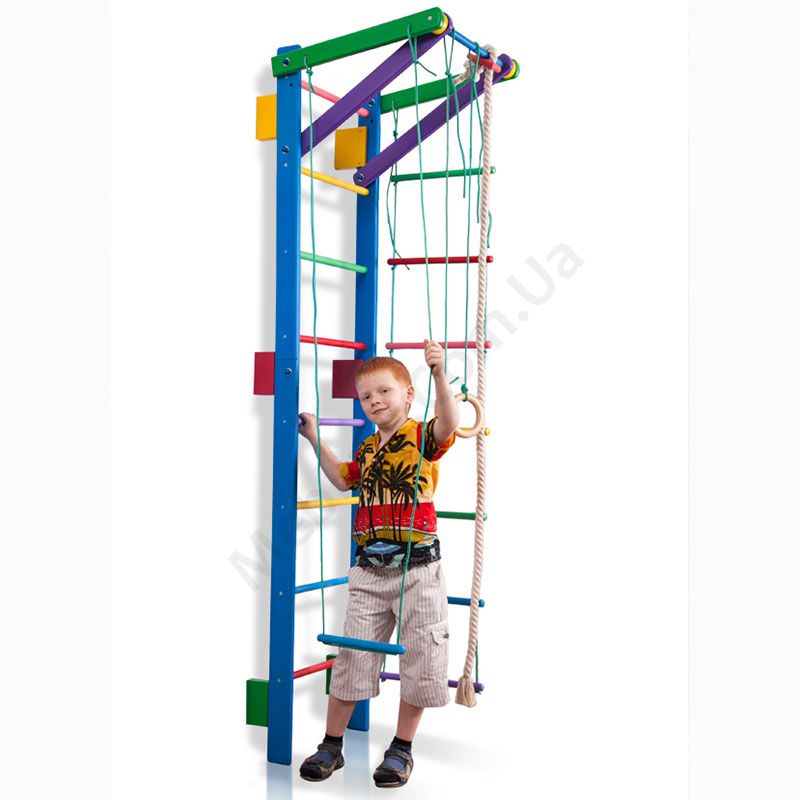 Шведська стінка з турніком, канатом, кільцями, трапецією та мотузковими сходами.