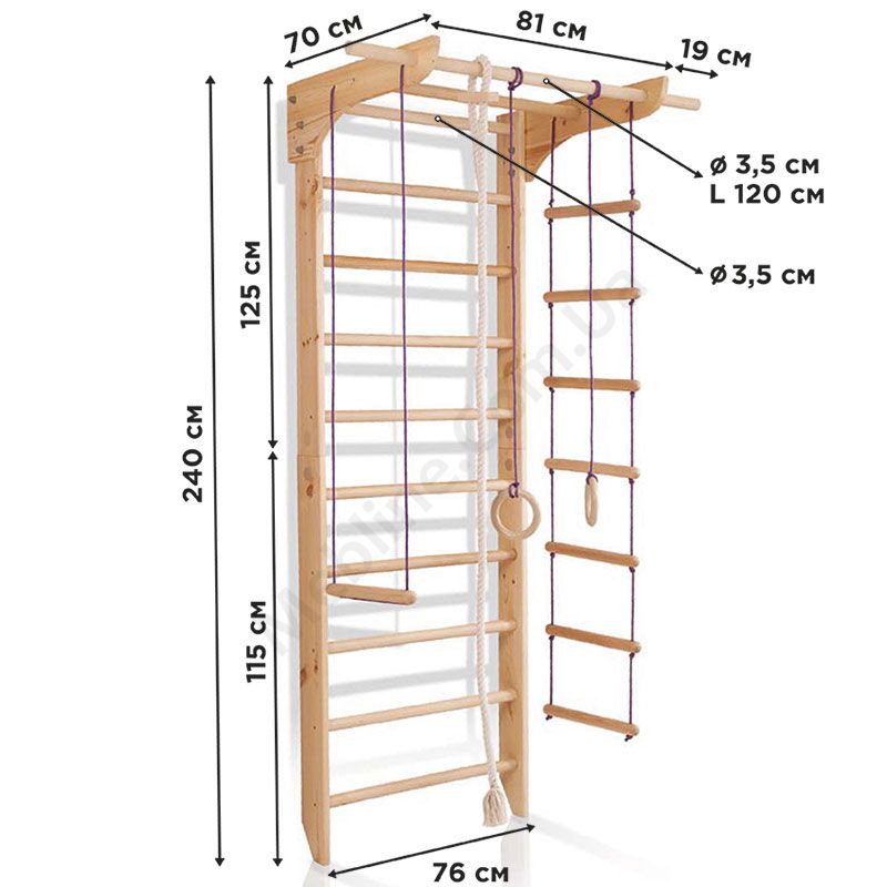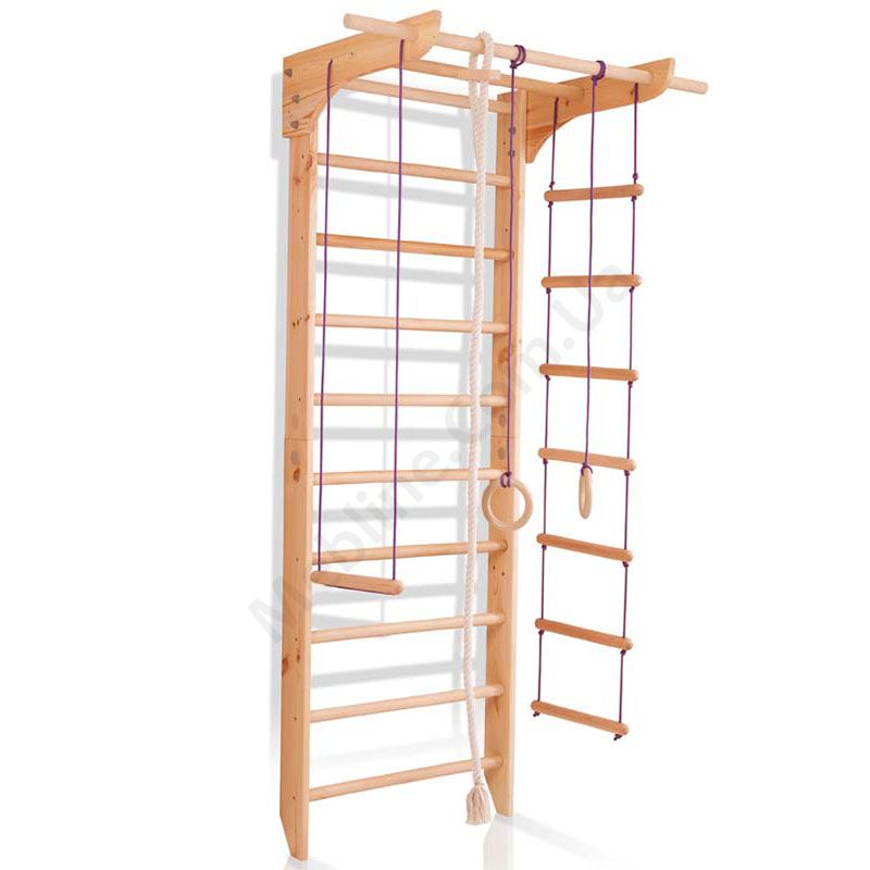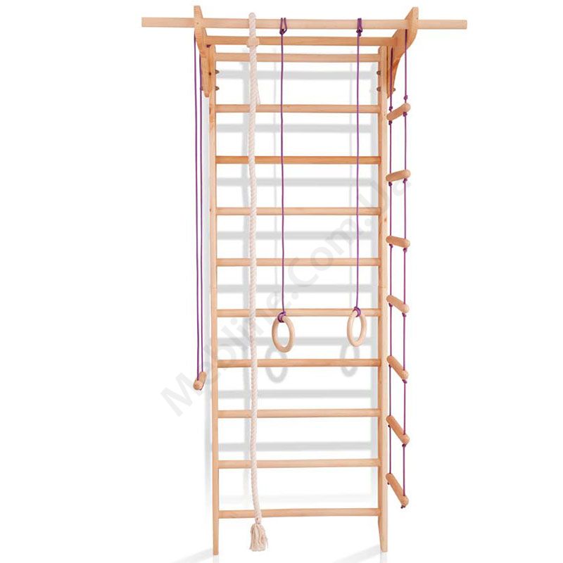 Дерев’яна шведська стінка з канатом, трапецією та драбиною.