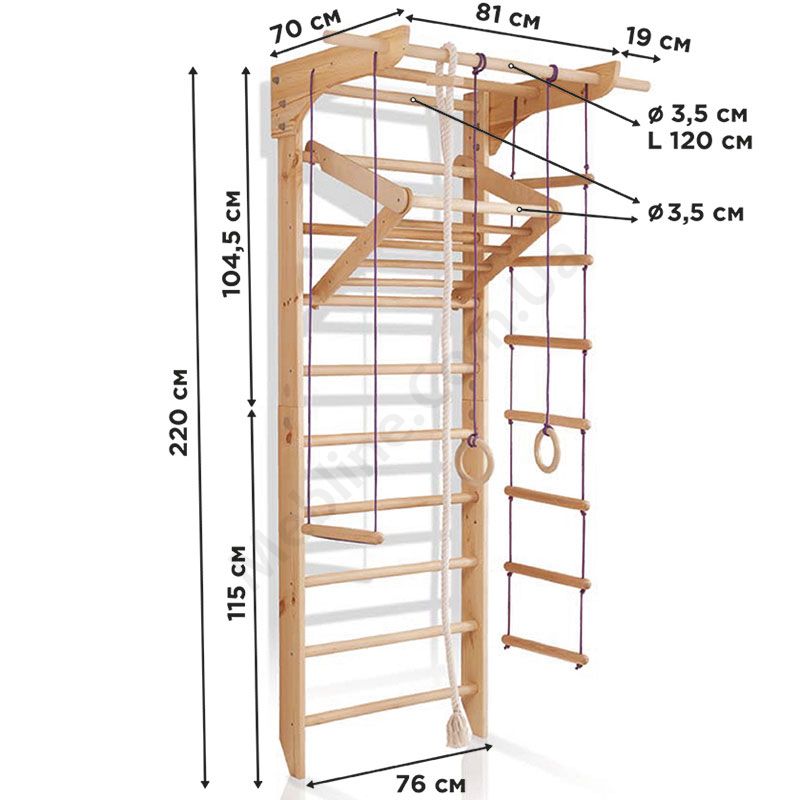 Дерев’яна шведська стінка з турніком, трапецією та драбиною.