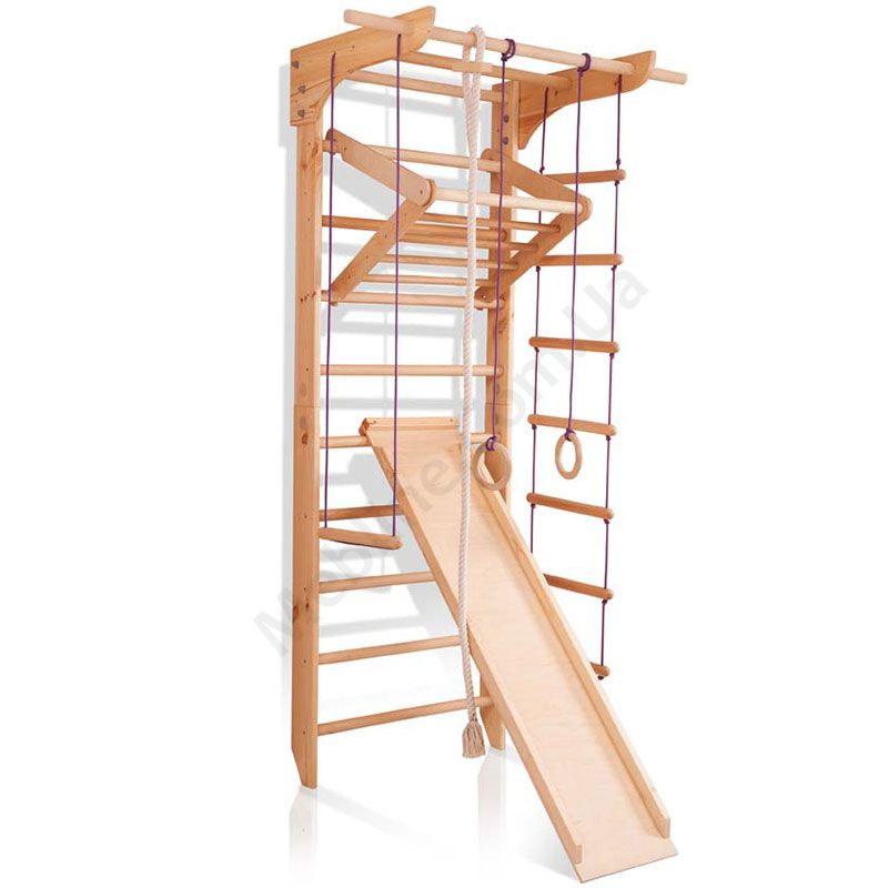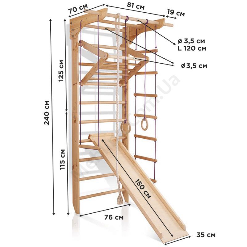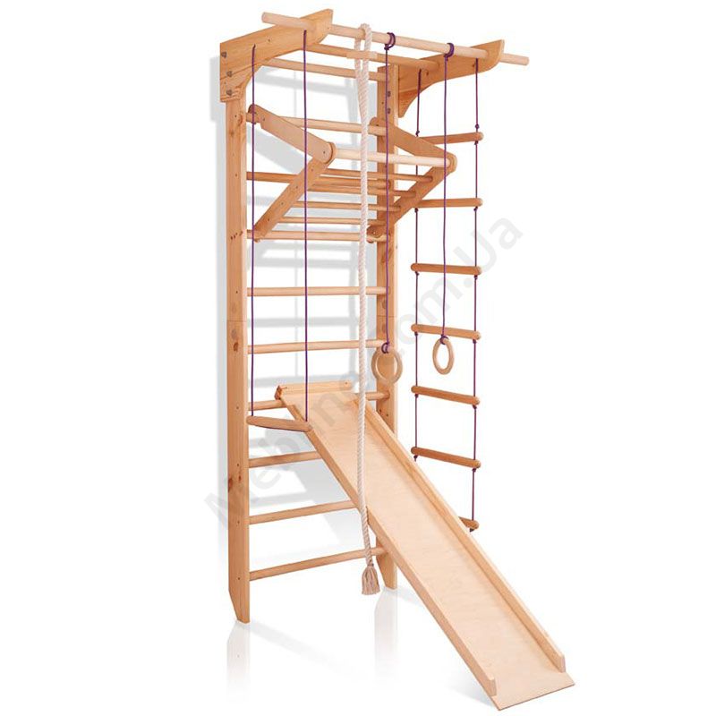 Дерев’яна шведська стінка з турніком, дошкою та канатом.
