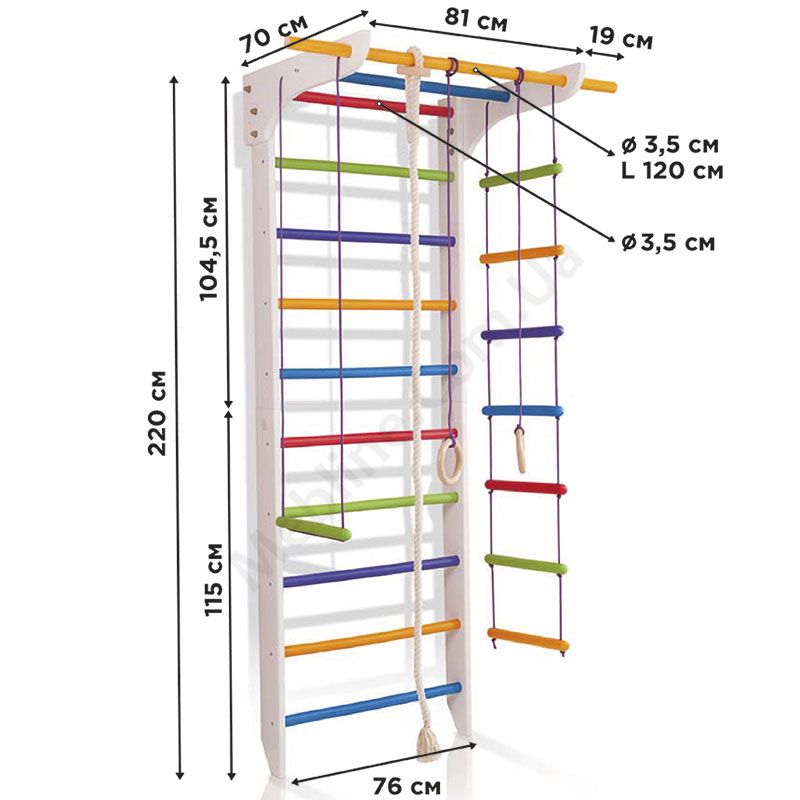 Дерев’яна шведська стінка з канатом, трапецією та драбиною.