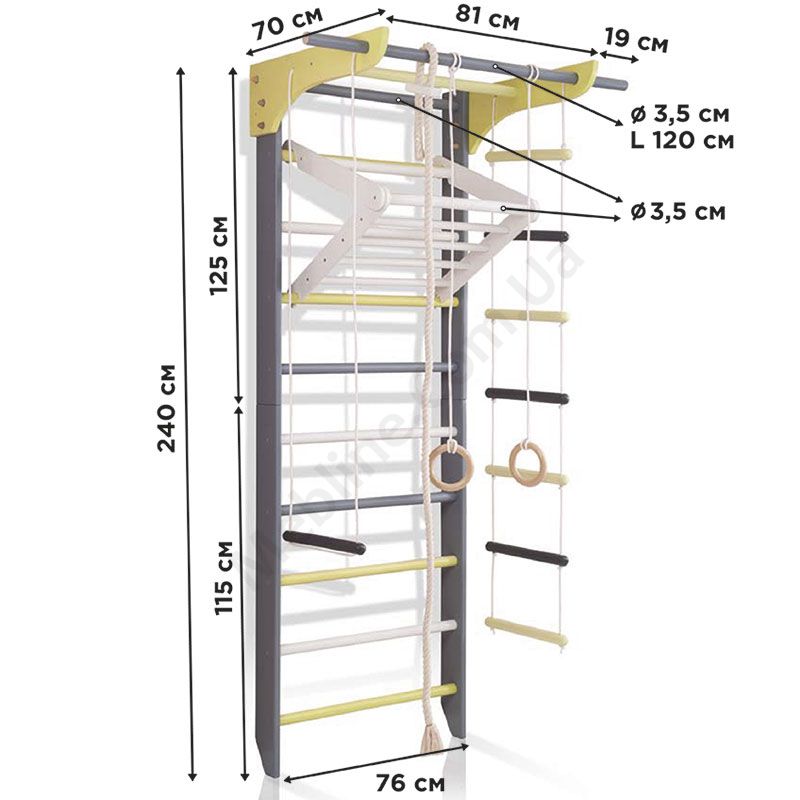 Дерев’яна шведська стінка з турніком, трапецією та драбиною.