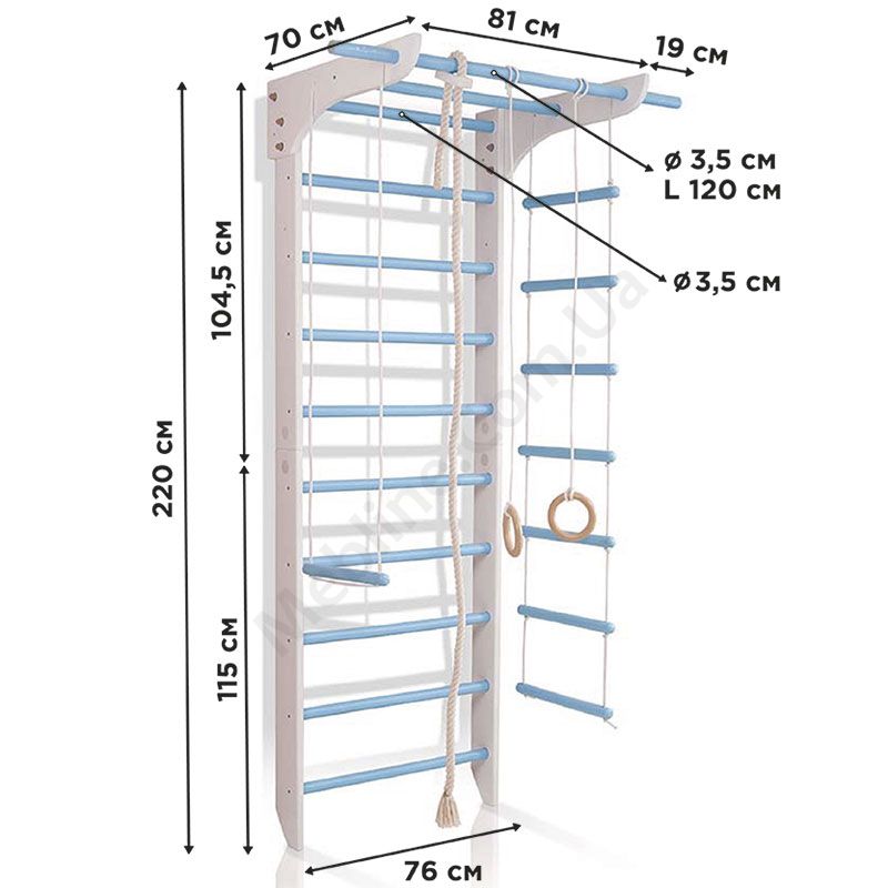 Дерев’яна шведська стінка з канатом, трапецією та драбиною.