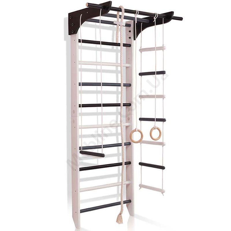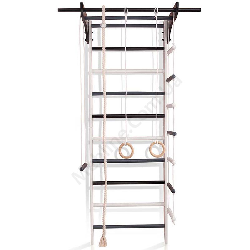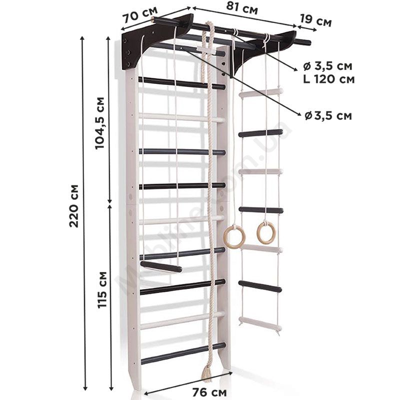 Дерев’яна шведська стінка з канатом, трапецією та драбиною.
