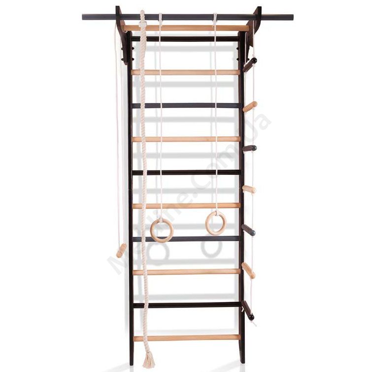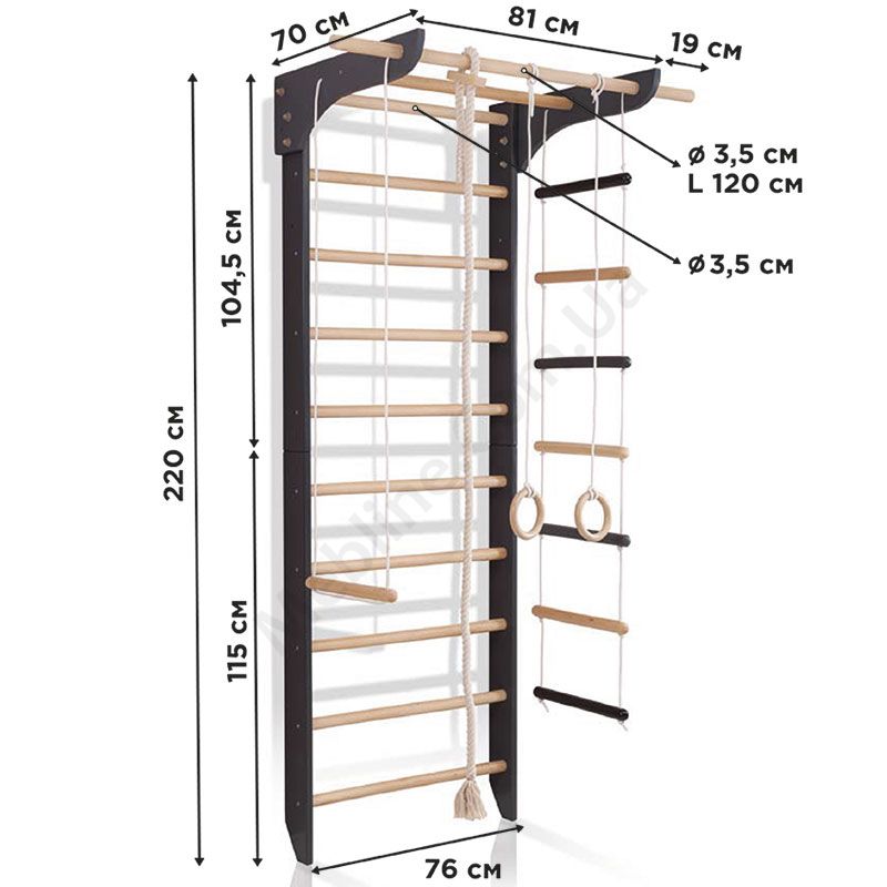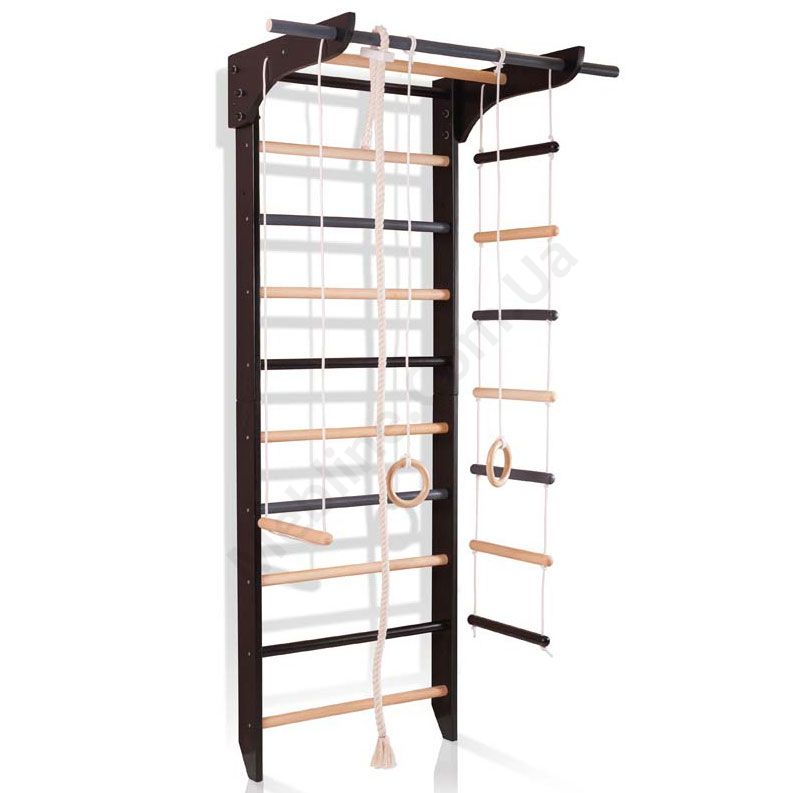 Дерев’яна шведська стінка з канатом, трапецією та драбиною.