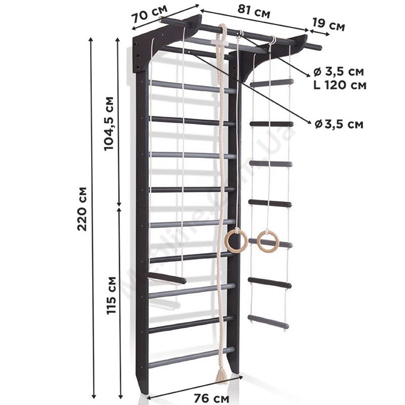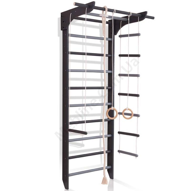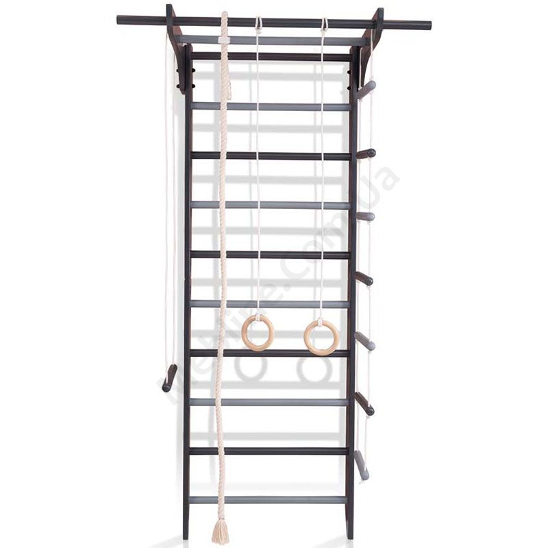 Дерев’яна шведська стінка з канатом, трапецією та драбиною.