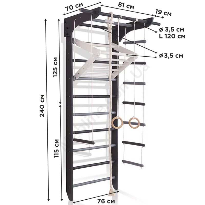 Дерев’яна шведська стінка з турніком, трапецією та драбиною.