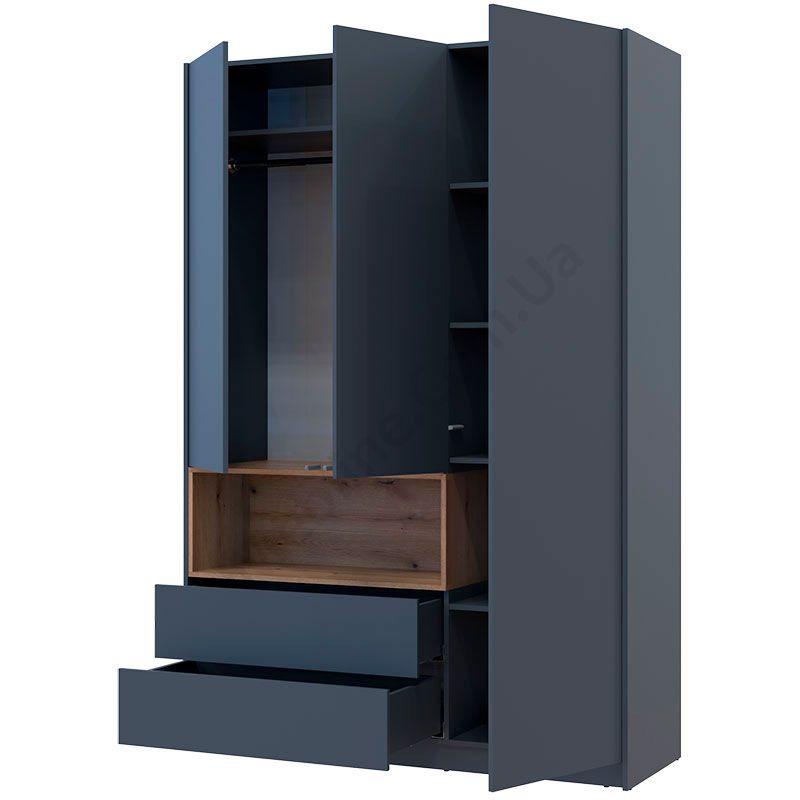 Шафа з дверцятами, висувними шухлядами та відкритими полицями.