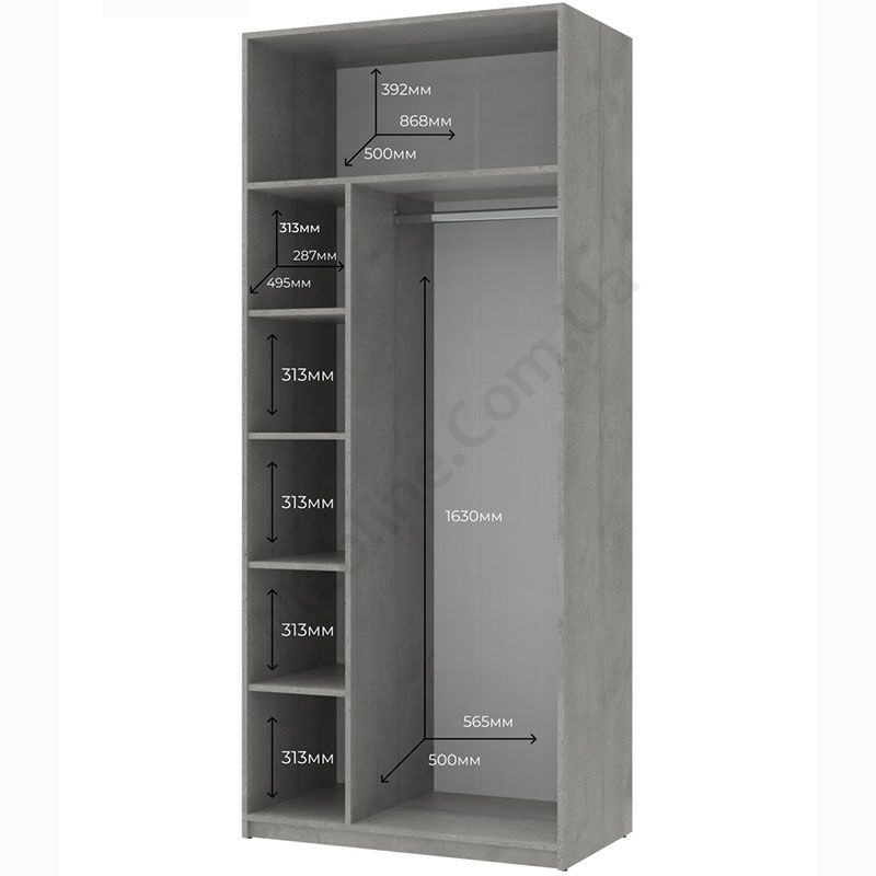 - За дверцятами штанга для одягу та п’ять полиць.