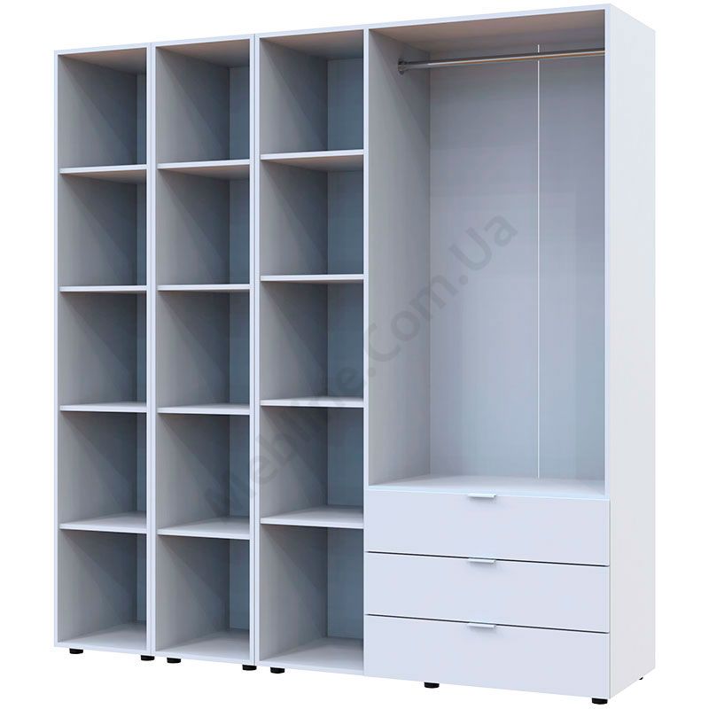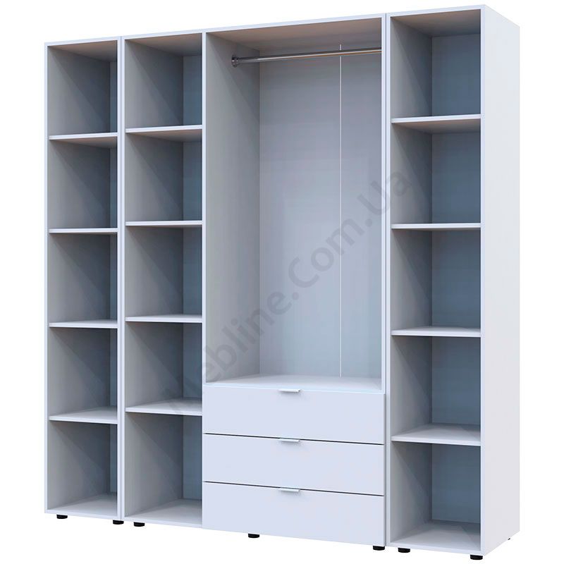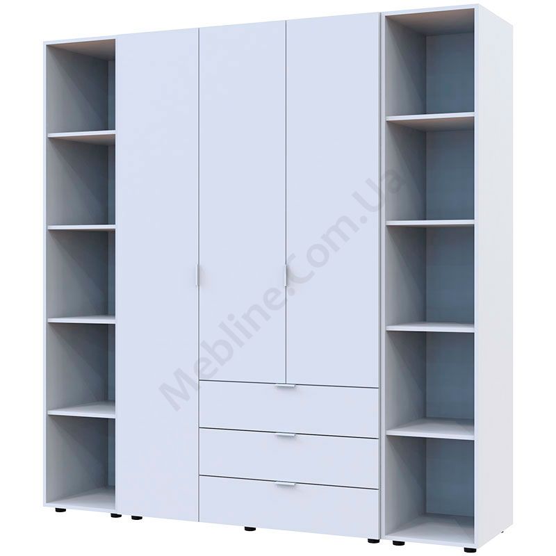 Тридверна шафа з двома стелажами та висувними шухлядами.