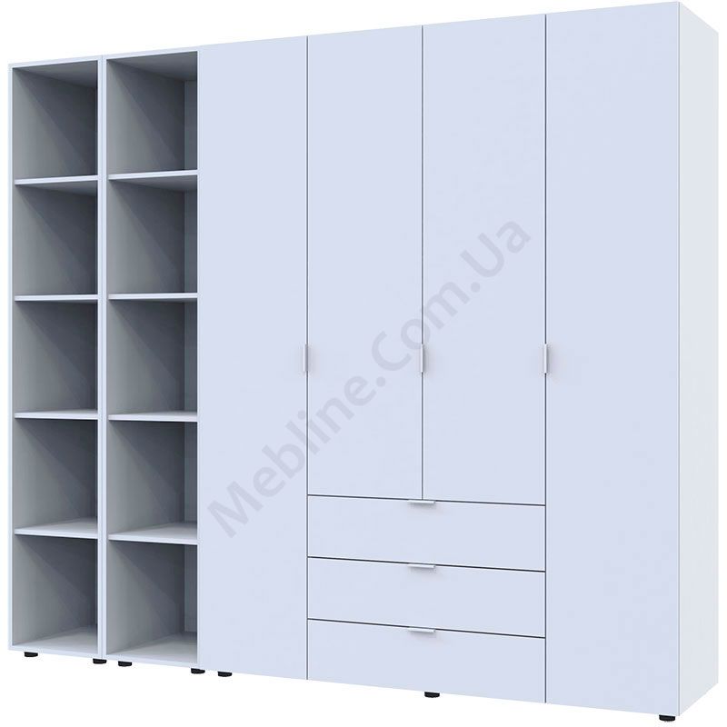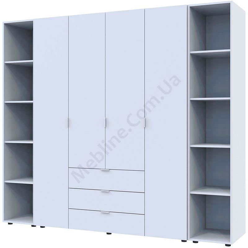 Чотиридверна шафа з двома стелажами та висувними шухлядами.