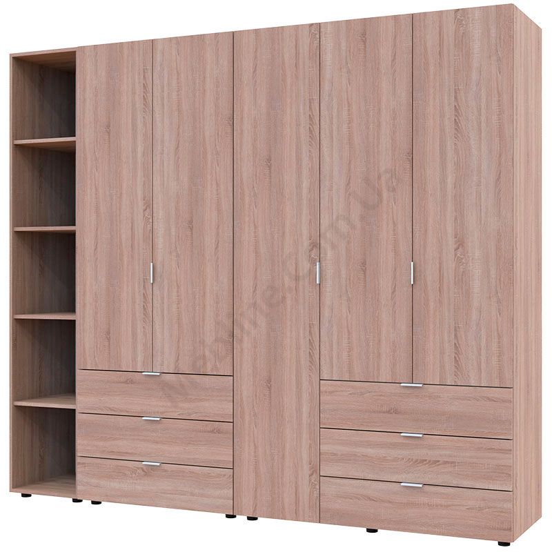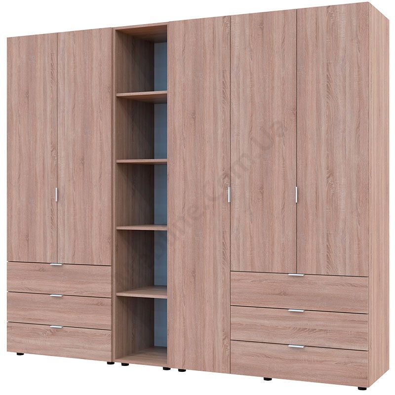 Тридверна та дводверна шафи зі стелажем та висувними шухлядами.