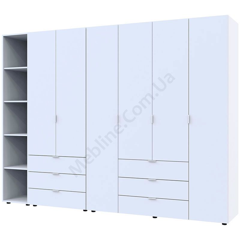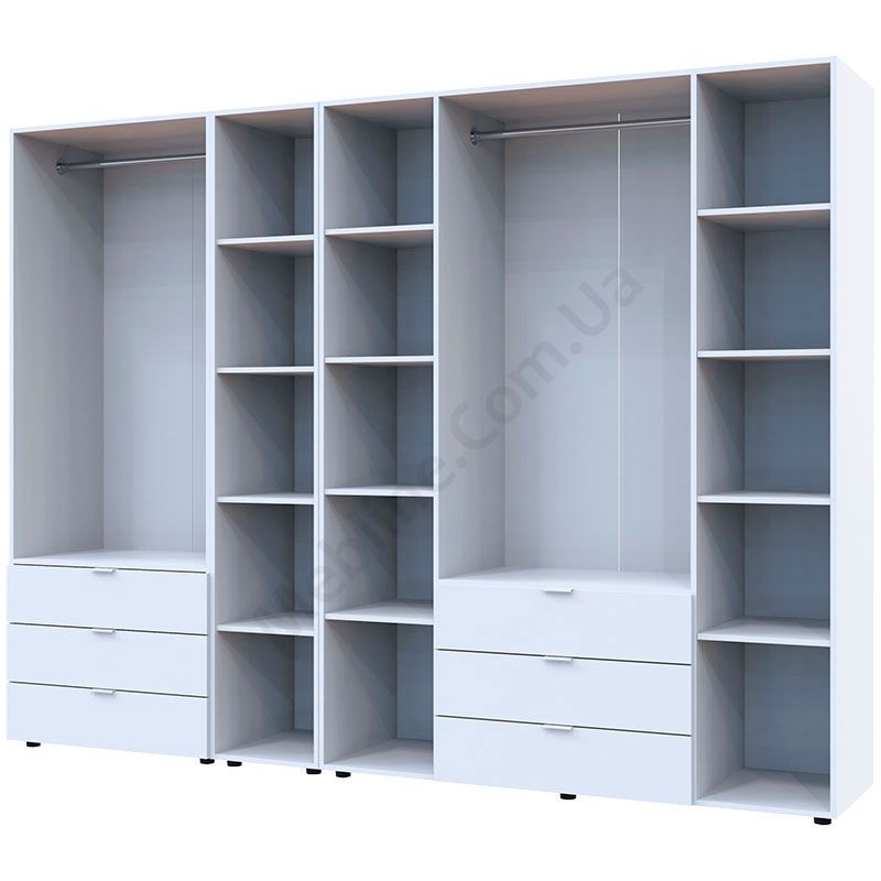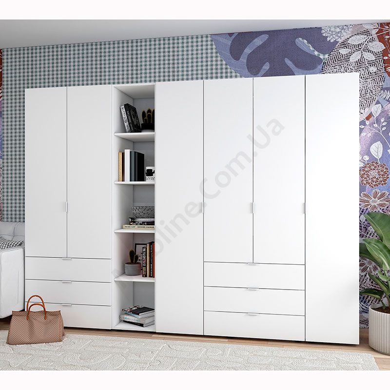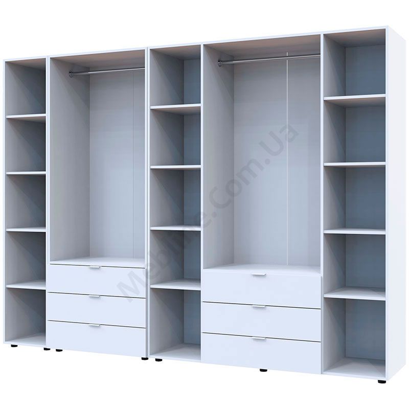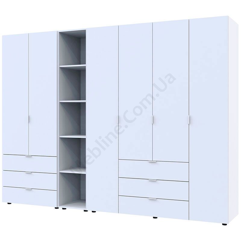 Чотиридверна та дводверна шафи зі стелажем та висувними шухлядами.