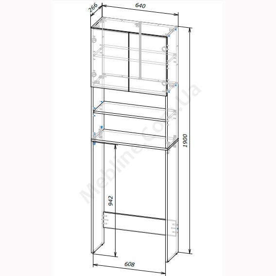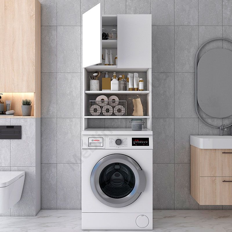 Тумба над пральною машинкою з дверцятами та відкритими полицями.