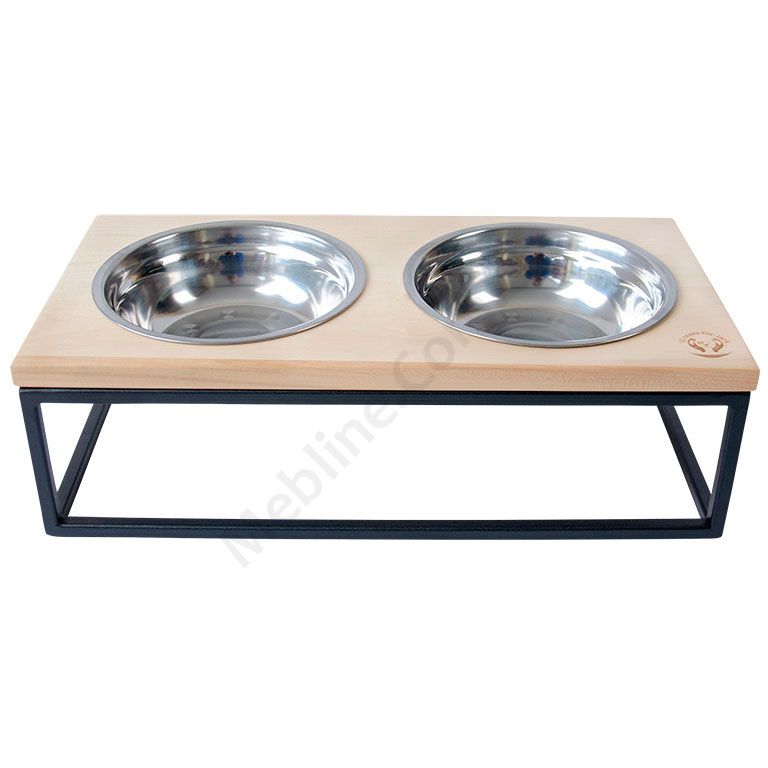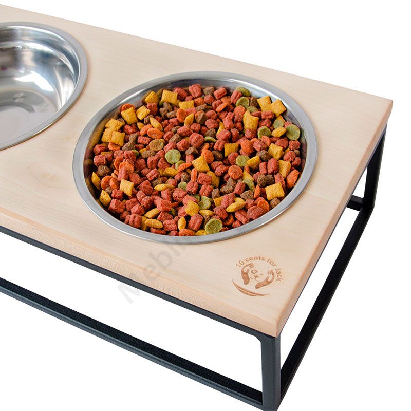 Дві металеві миски для собаки на підставці з дерев’яною стільницею.