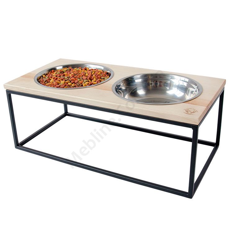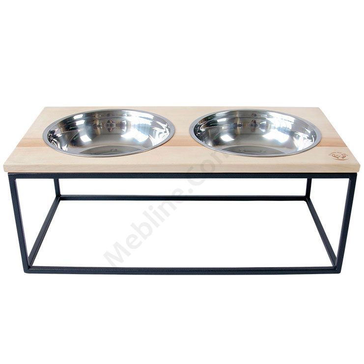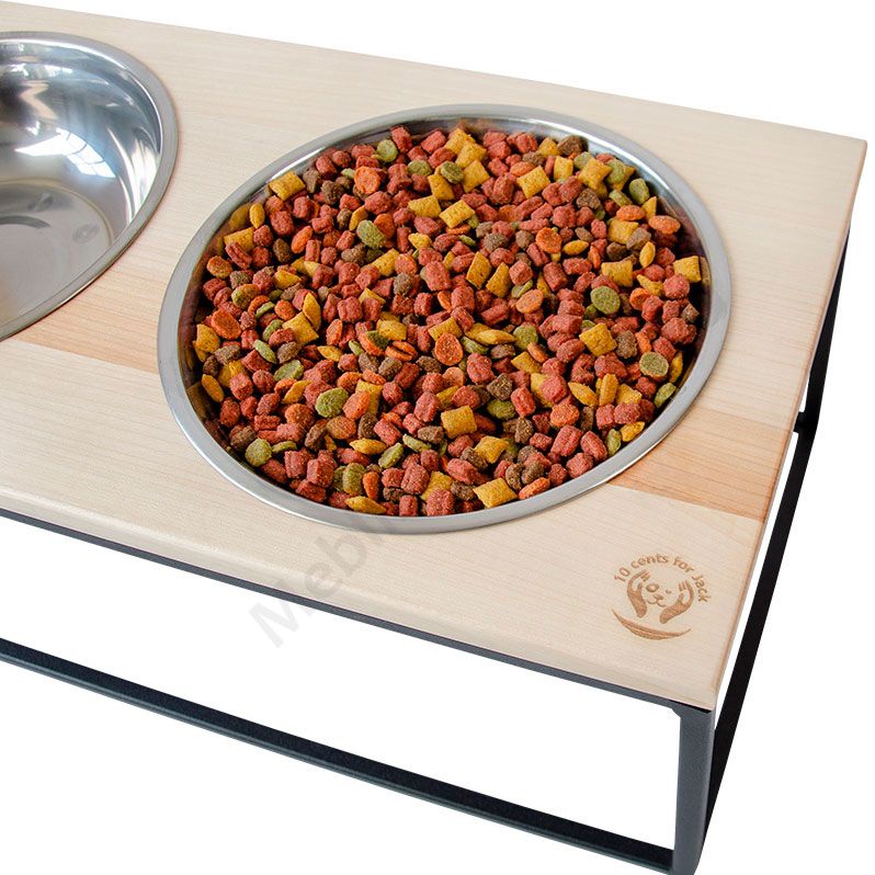 Дві металеві миски для собаки на підставці з дерев’яною стільницею.