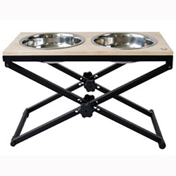Дві металеві миски для собаки на підставці з дерев’яною стільницею.
