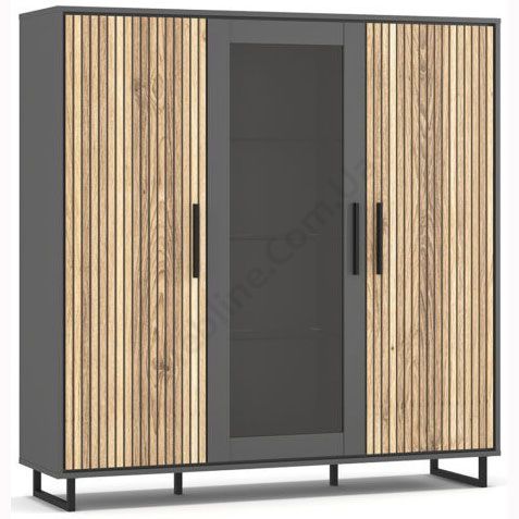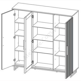 - Троє розпашних дверцят, середні зі скляною вставкою.