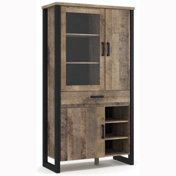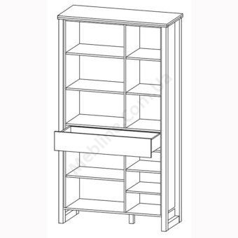 Вітрина з дверцятами, відкритими полицями та висувною шухлядою.