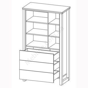Невисока шафа з відкритими полицями та висувними шухлядами.