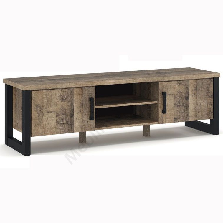 Тумба під телевізор з дверцятами та відкритими полицями.