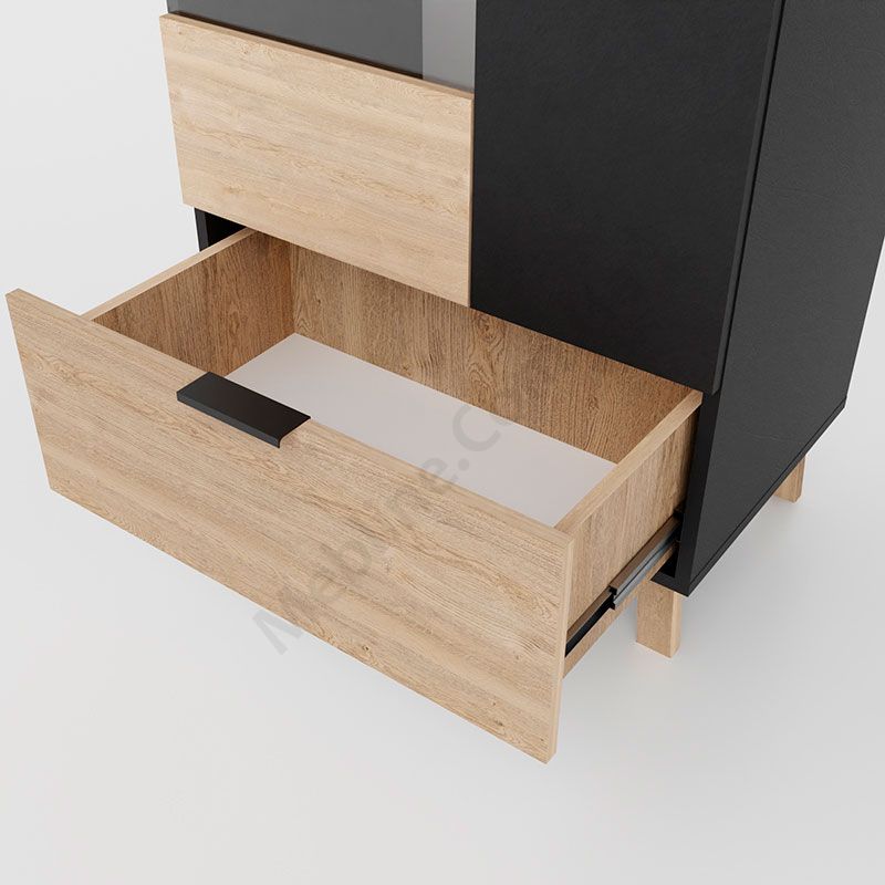 - Двоє розпашних дверцят зі скляними вставками та одна з ДСП.