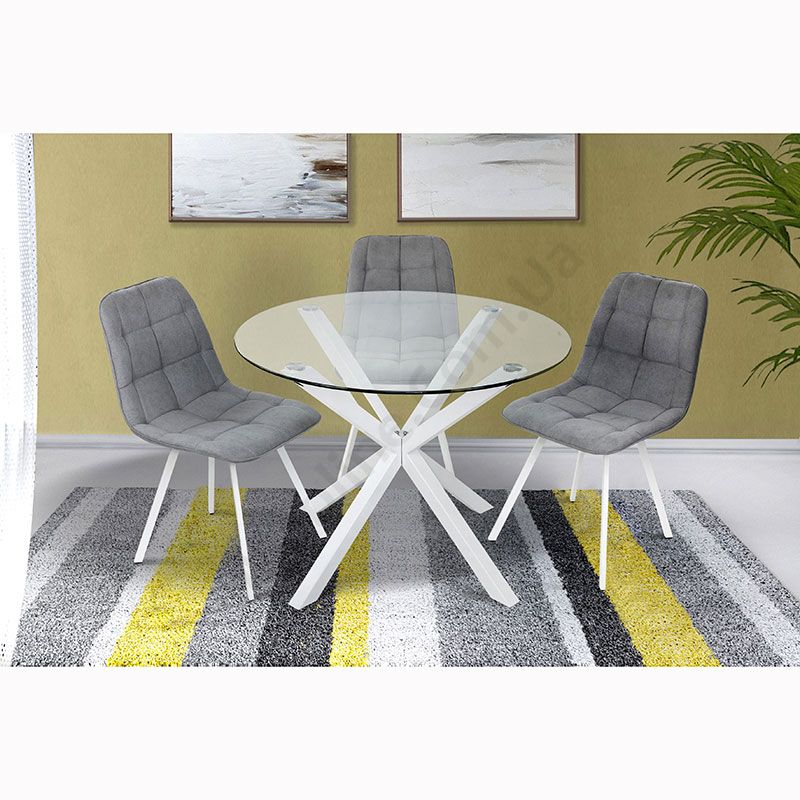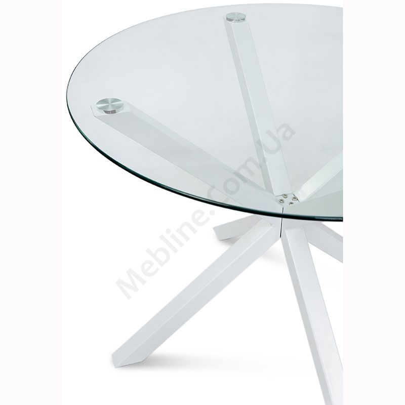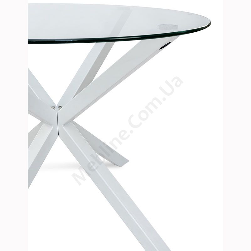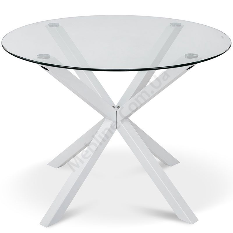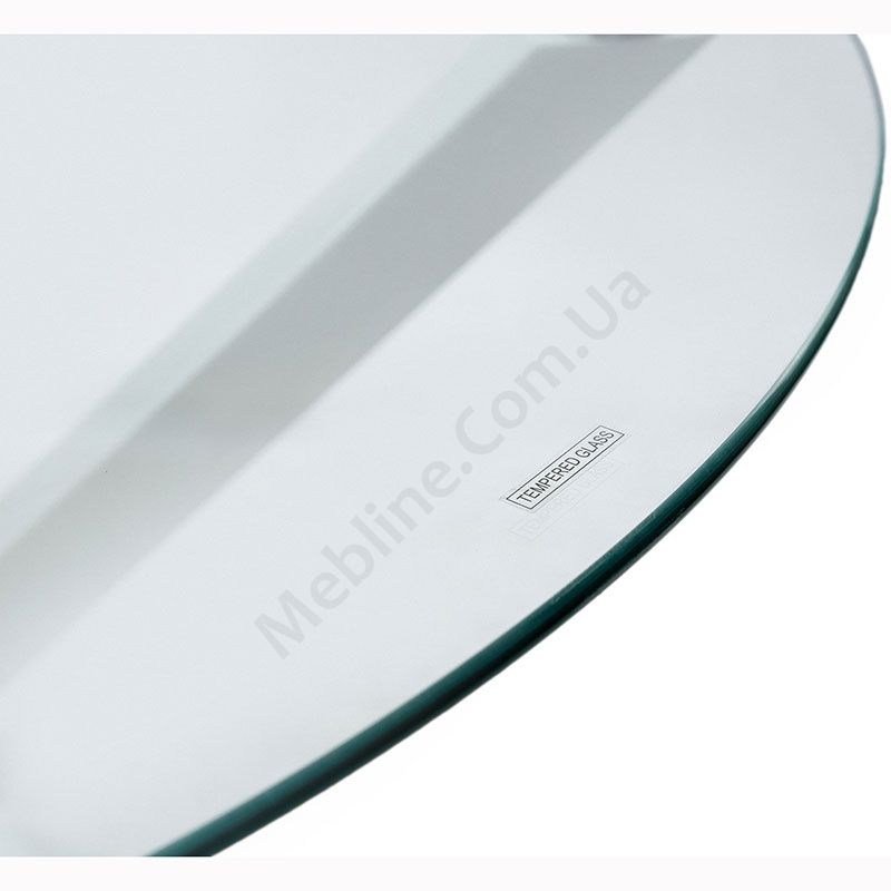 Обідній стіл із круглою скляною стільницею на металевих ніжках.