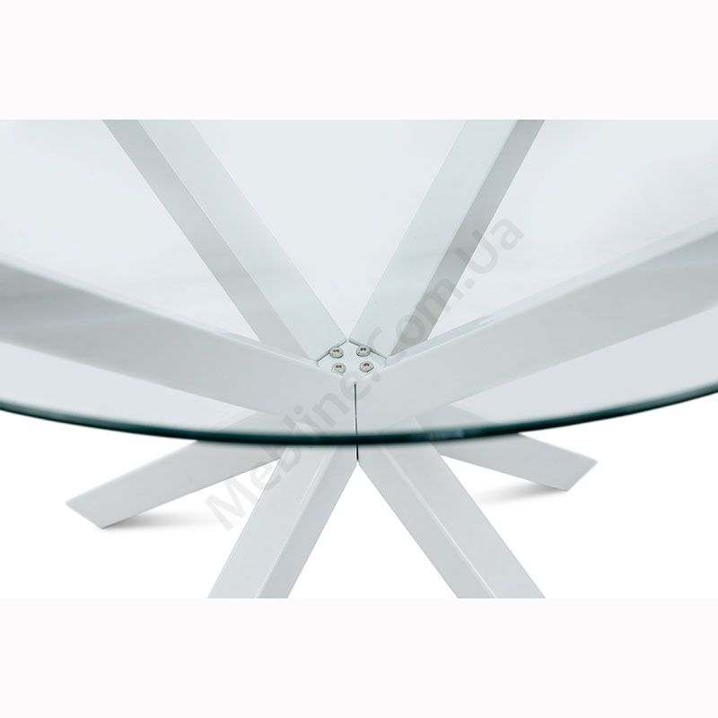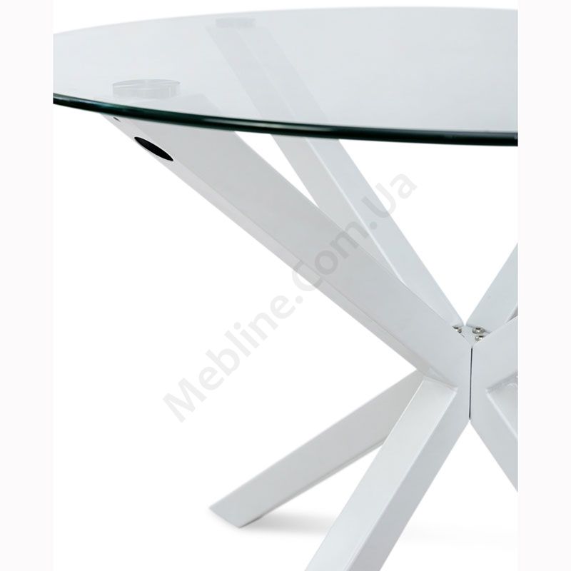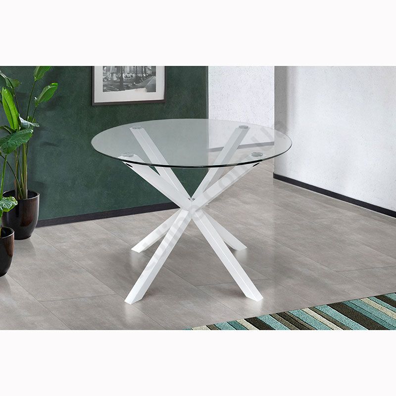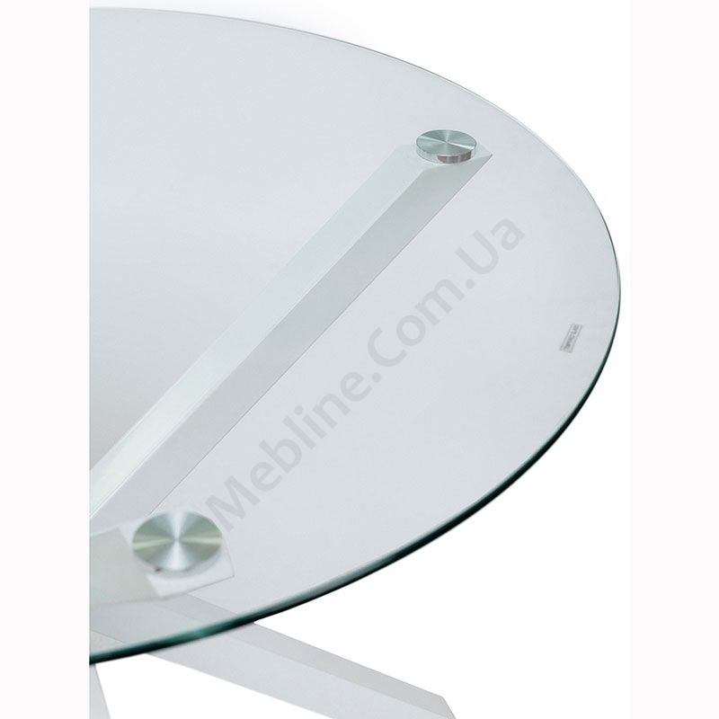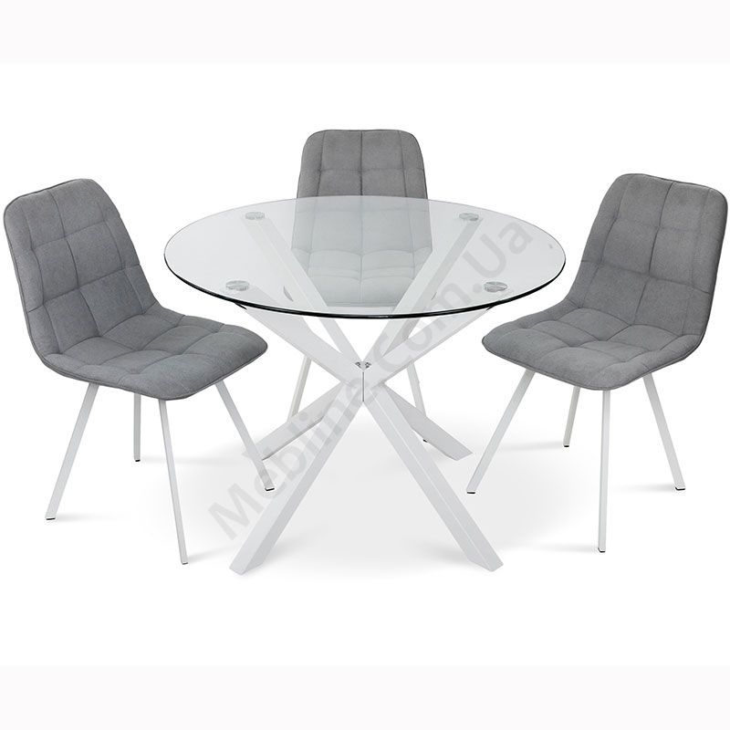 Обідній стіл із круглою скляною стільницею на металевих ніжках.
