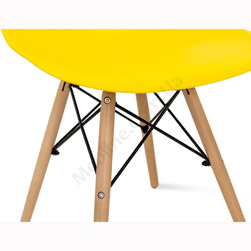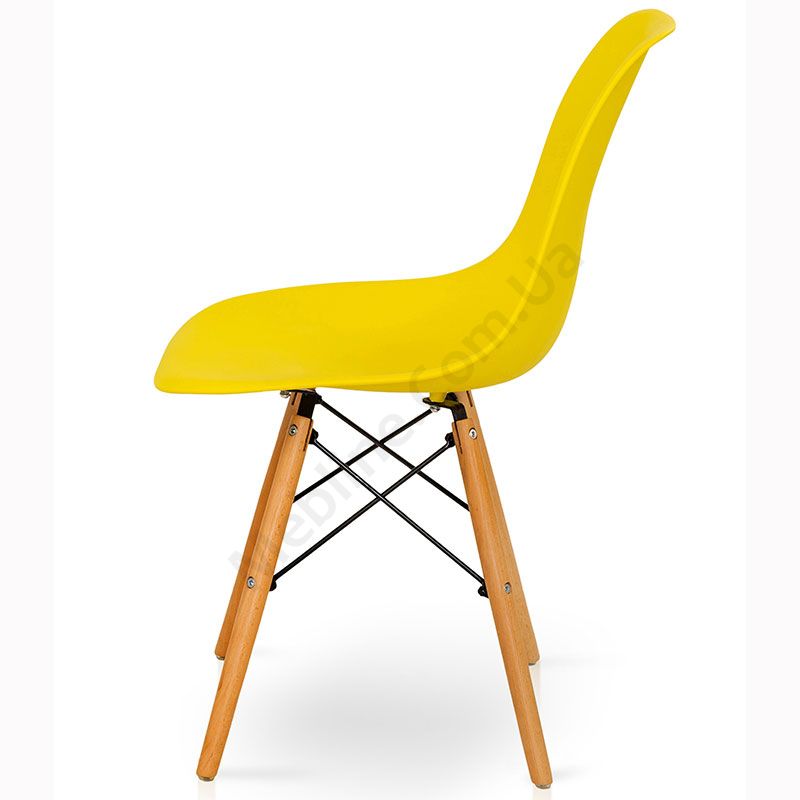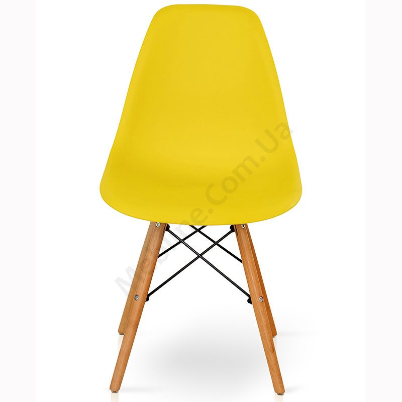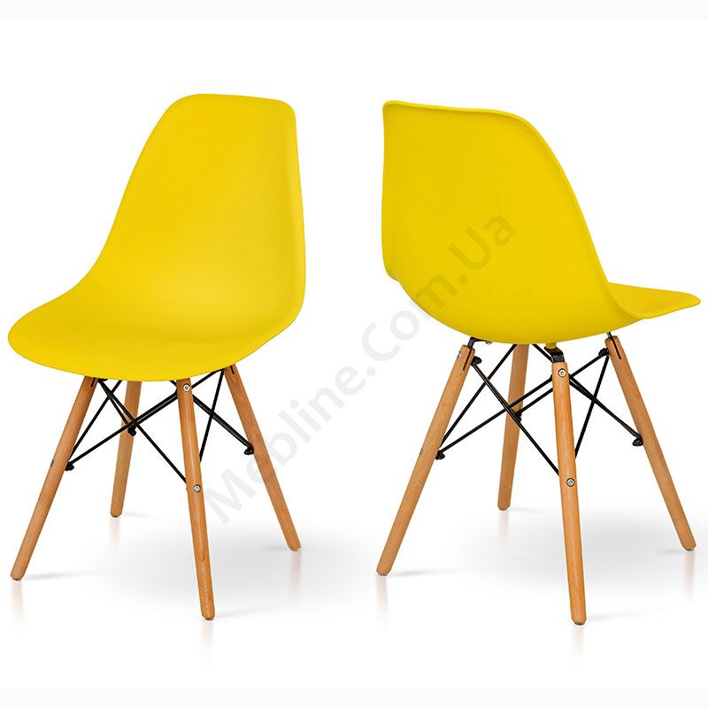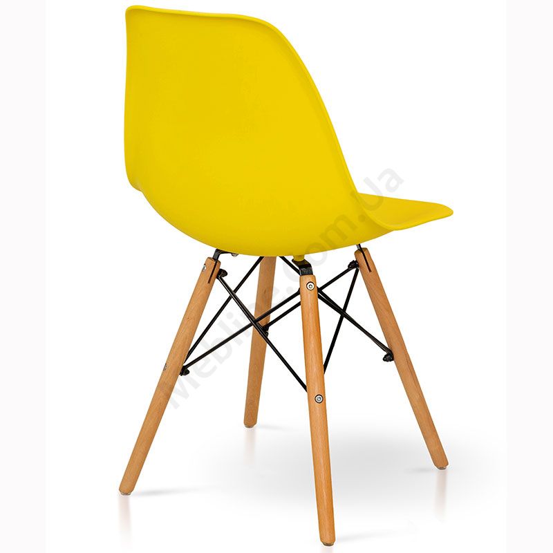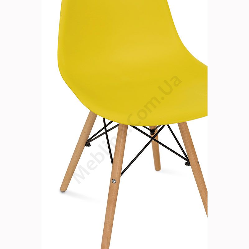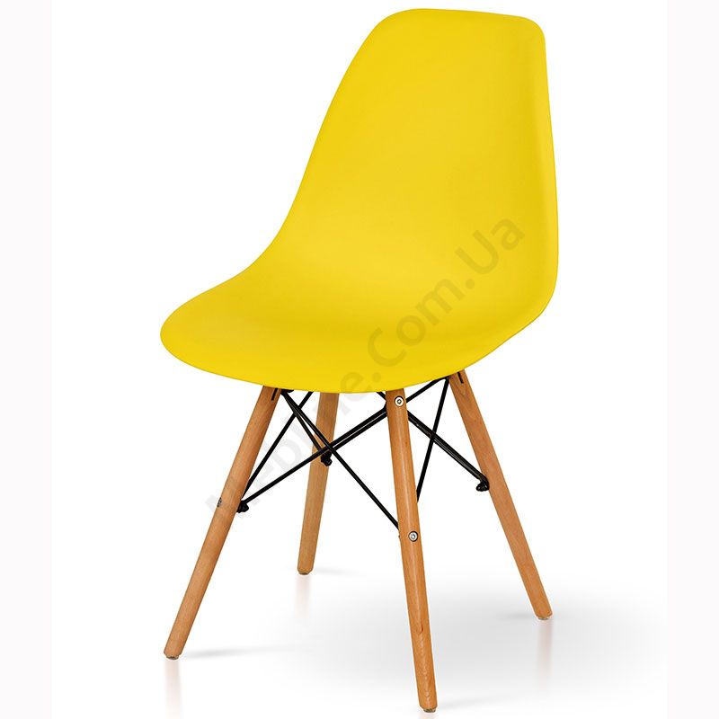 Стілець на дерев’яних ніжках с пластиковим сидінням жовтого кольору.