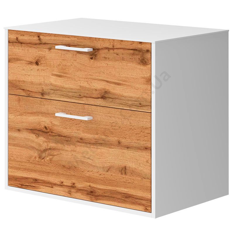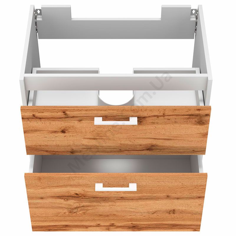 - Зовні тумба покрита матовою емаллю білого кольору, фасад кольору дуба вотан.