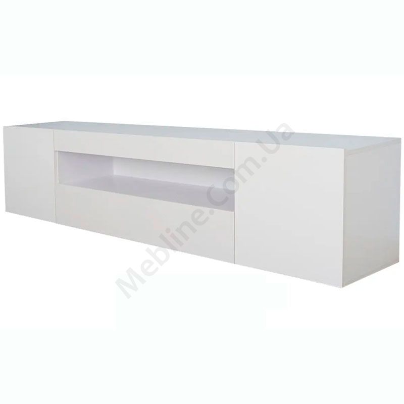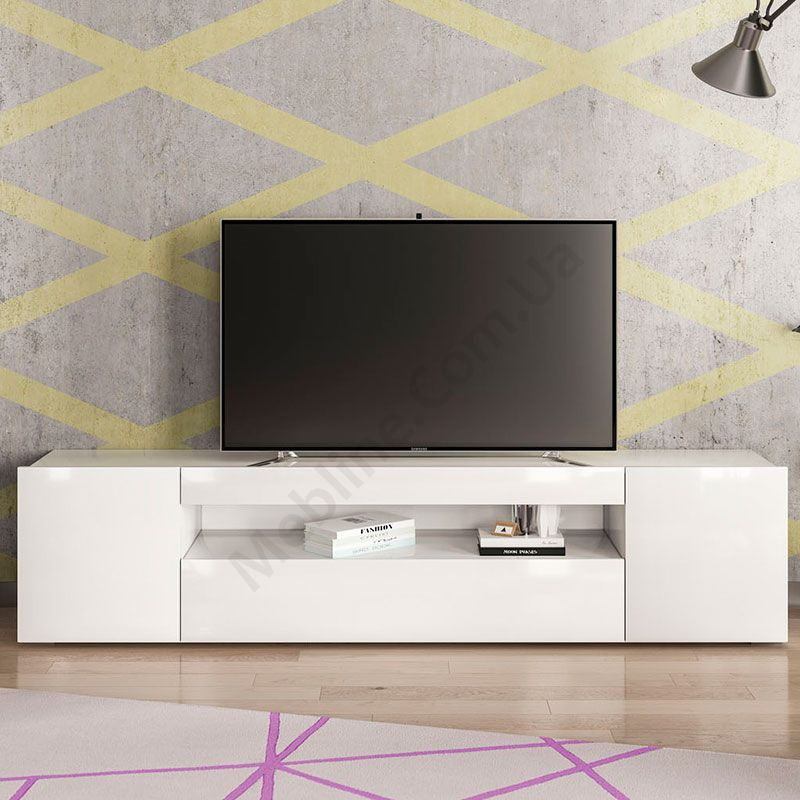 Тумба під телевізор з дверцятами та відкритою полицею.
