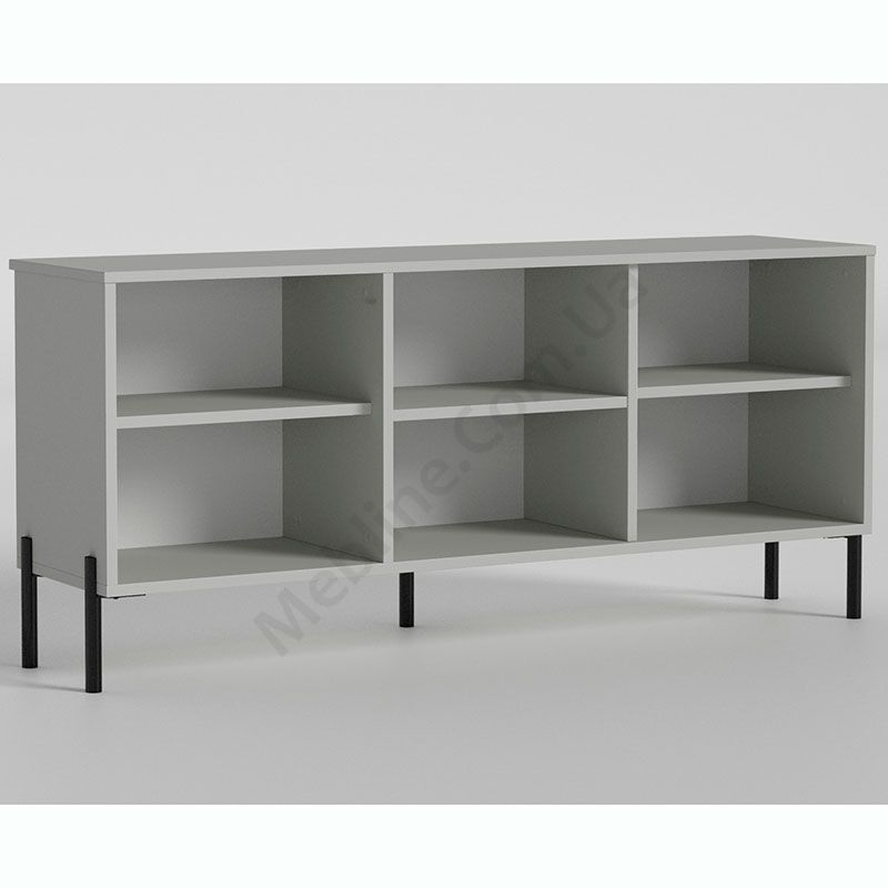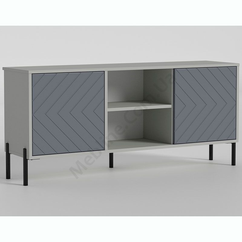 Тумба під телевізор на ніжках з дверцятами та відкритими полицями.